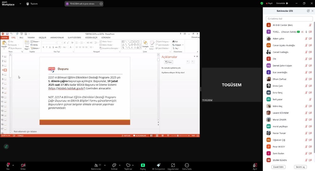 TÜBİTAK 2237-A ve 2237-B programlarına yönelik tanıtım etkinliği, akademik camiadan ilgi gördü. Etkinlik hem çevrim içi ortamda hem de yüz yüze olacak şekilde hibrit olarak gerçekleştirildi. Etkinlik kapsamında, Dr. Öğr. Üyesi Tuğba KOCADAĞ ÜNVER tarafından, proje hazırlama ve başvuru süreçleri hakkında detaylı bilgiler verildi. Sunumda, projelerin temel yapısı, değerlendirme kriterleri, sürdürülebilirlik unsurları ve başvuru süreçleri ele alındı. Katılımcılar, merak ettikleri soruları yöneltme fırsatı buldu ve etkinlik proje hazırlamak isteyenler için yol gösterici oldu. Gerçekleştirilen bu etkinlik araştırmacılar için önemli bir bilgi kaynağı olurken, bilimsel projelere yönelik farkındalık sağlamaya da katkıda bulundu. Etkinlik sonunda Eğitim Fakültemiz Dekan Yardımcısı Prof. Dr. Adem ŞAHİN, Dr. Öğr. Üyesi Tuğba KOCADAĞ ÜNVER’e teşekkür belgesi takdim etti. Bu tür bilgilendirici etkinliklerin devam edeceği de belirtilerek etkinlik başarılı bir şekilde tamamlandı.