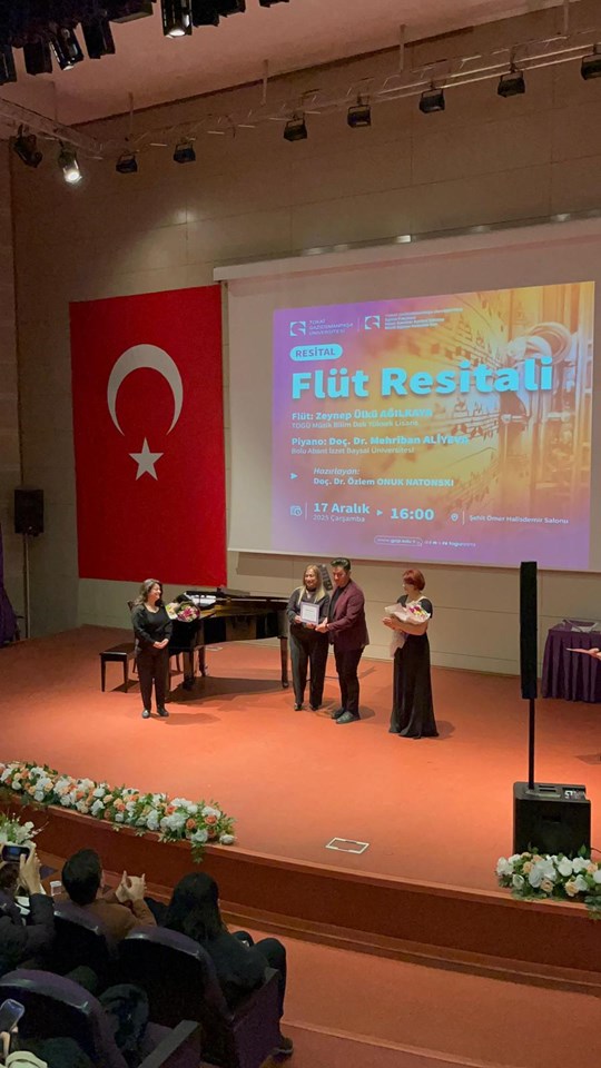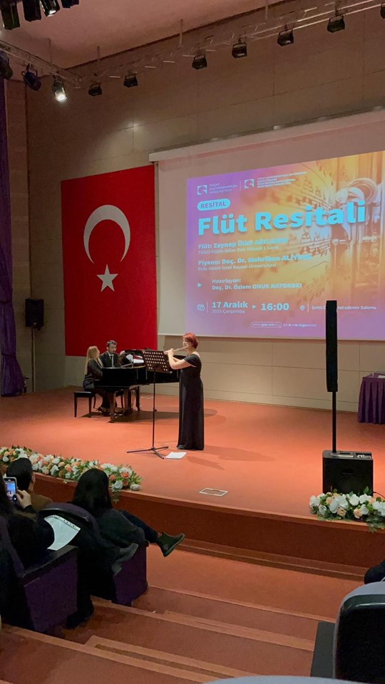 Fakültemiz Güzel Sanatlar Eğitimi Bölümü Müzik Eğitimi Anabilim Dalı yüksek lisans öğrencisi Zeynep Ülkü Ağıllıkaya tarafından gerçekleştirilen Flüt Resitali, 17 Aralık 2025 Çarşamba günü Şehit Ömer Halisdemir Salonu’nda dinleyicilerle buluştu. Resitalde piyanoda Doç. Dr. Mehriban Aliyeva eşlik ederken, etkinlik Doç. Dr. Özlem Onuk Natonski danışmanlığında hazırlandı. Akademik ve sanatsal niteliğiyle öne çıkan program, izleyiciler tarafından ilgiyle takip edildi. Etkinliğin, Müzik Eğitimi Anabilim Dalı bünyesinde gerçekleştirilen benzer sanatsal ve akademik çalışmaların bir parçası olarak önümüzdeki dönemlerde de devam etmesinin planlandığı ifade edildi.