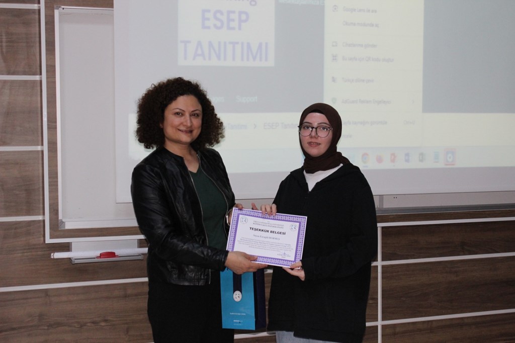 Program kapsamında, üniversiteler arası düzenlenen etkinlikte elde edilen başarıya katkılarından dolayı Esragül Durmuş’a teşekkür belgesi ve hediye takdim edildi.